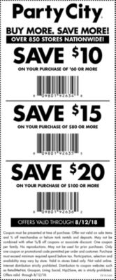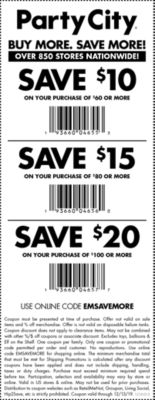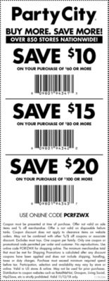 Party City Coupons Codes, printable code online / May 2022 Party City coupons and free promo discounts, sale. Scrooge Coupons. Party City Coupons, Promo Codes & Deals 2022. Sale. OFF. Promo. $10 off select orders over $75 - In-Store Coupon. Get this Deal. Sale. OFF. Promo. Enjoy free ground shipping on orders $49+. Get this Deal. Sale. OFF. Promo. $10 off orders over $100.