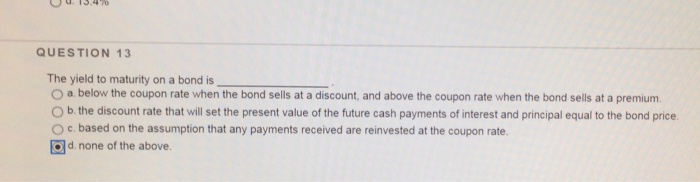 Solved Question 1 of 71 The yield to maturity on a coupon - Chegg Finance. Finance questions and answers. Question 1 of 71 The yield to maturity on a coupon bond is … · always greater than the coupon rate. · the rate an investor earns if she holds the bond to the maturity date, assuming she can reinvest all coupons at the current yield. · the rate an investor earns if she holds the bond to the maturity ...